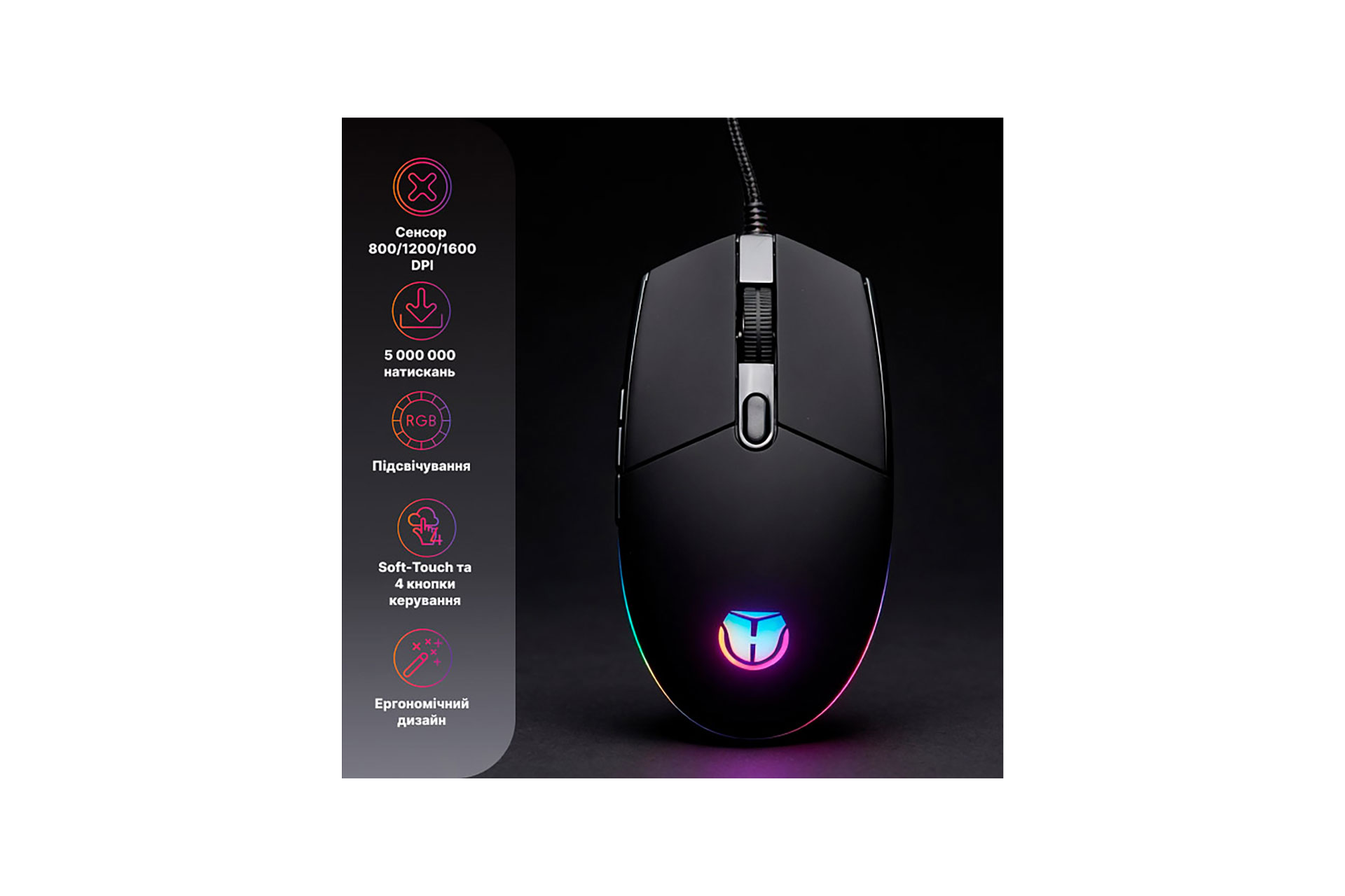 - Кабель USB: оплетений кабель довжиною 1.5 м