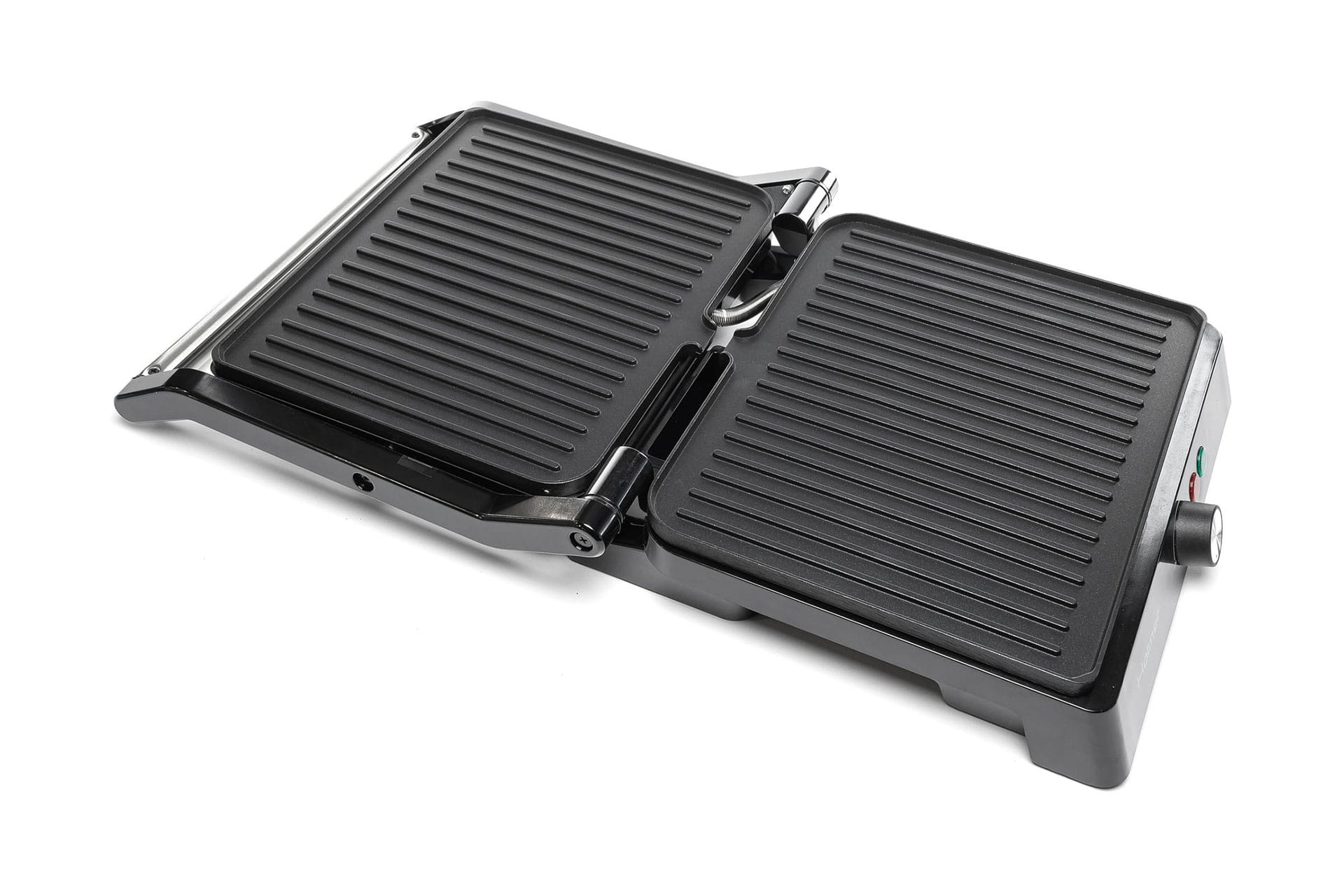 Гриль оснащений регулятором температури, який дозволяє налаштовувати нагрів від 140° до 210° С. Це дозволяє обирати оптимальний режим для різних типів продуктів. Притискна ручка з термоізоляцією забезпечує безпеку під час використання.