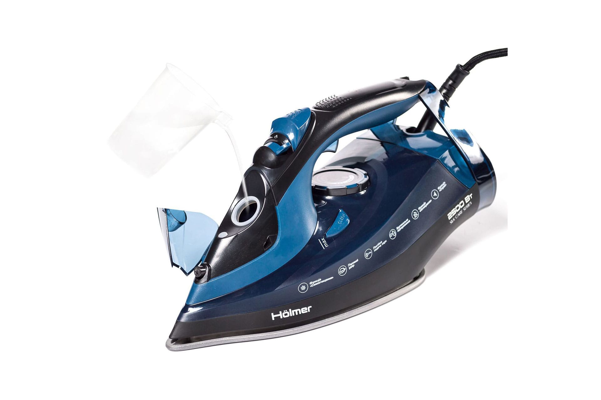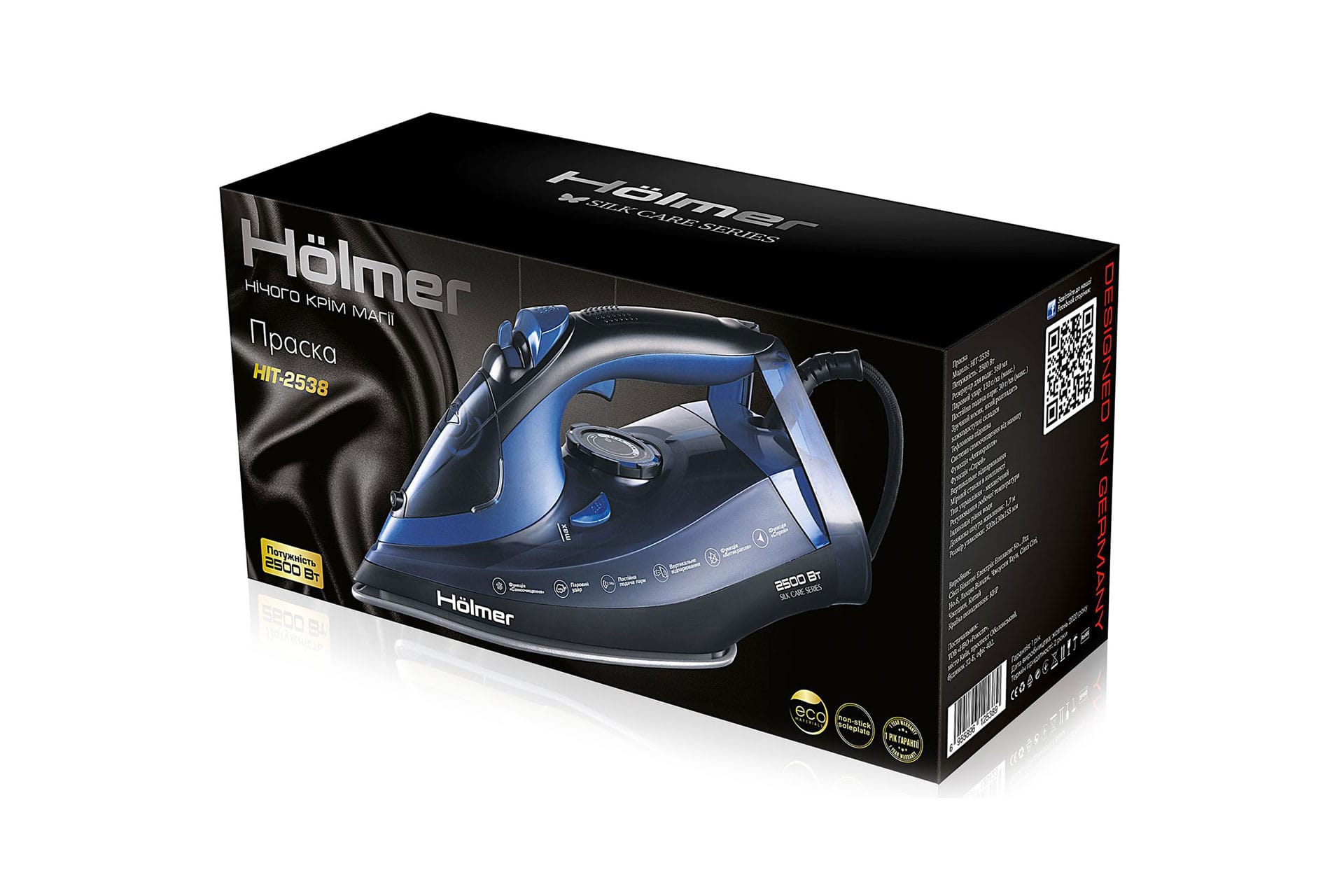 Праска Hölmer HIT-2538 для сухого прасування і з парою, має потужність 2500 Вт (час нагрівання max ~ 30 сек), паровий удар 130 г/хв, постійну подачу пара 30 г/хв. Тефлонове покриття підошви з невеликою фаскою по краю забезпечить легке ковзання по тканинах різних типів, не створює складок, повністю розгладжує всі ділянки.