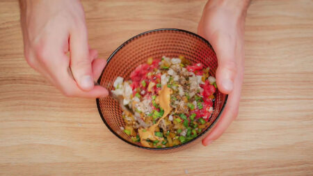Після ріжемо на дрібні шматочки або можна пропустити через м’ясорубку, використовуйте решітку з великими отворами. Додаємо перець, гірчицю, сіль та олію – перемішуємо.